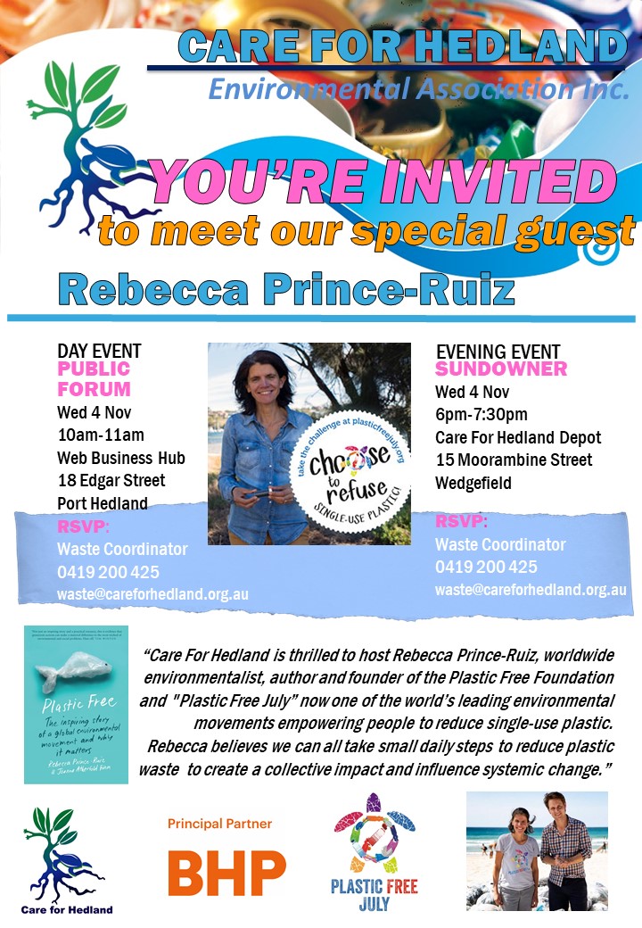 Come along from 10am to 11am at the Web Business Hub to meet Rebecca Prince-Ruiz. She is a worldwide environmentalist, author and founder of the Plastic Free Foundation and 'Plastic Free July', which is now one of the world's leading environmental movements empowering people to reduce single-use plastic.