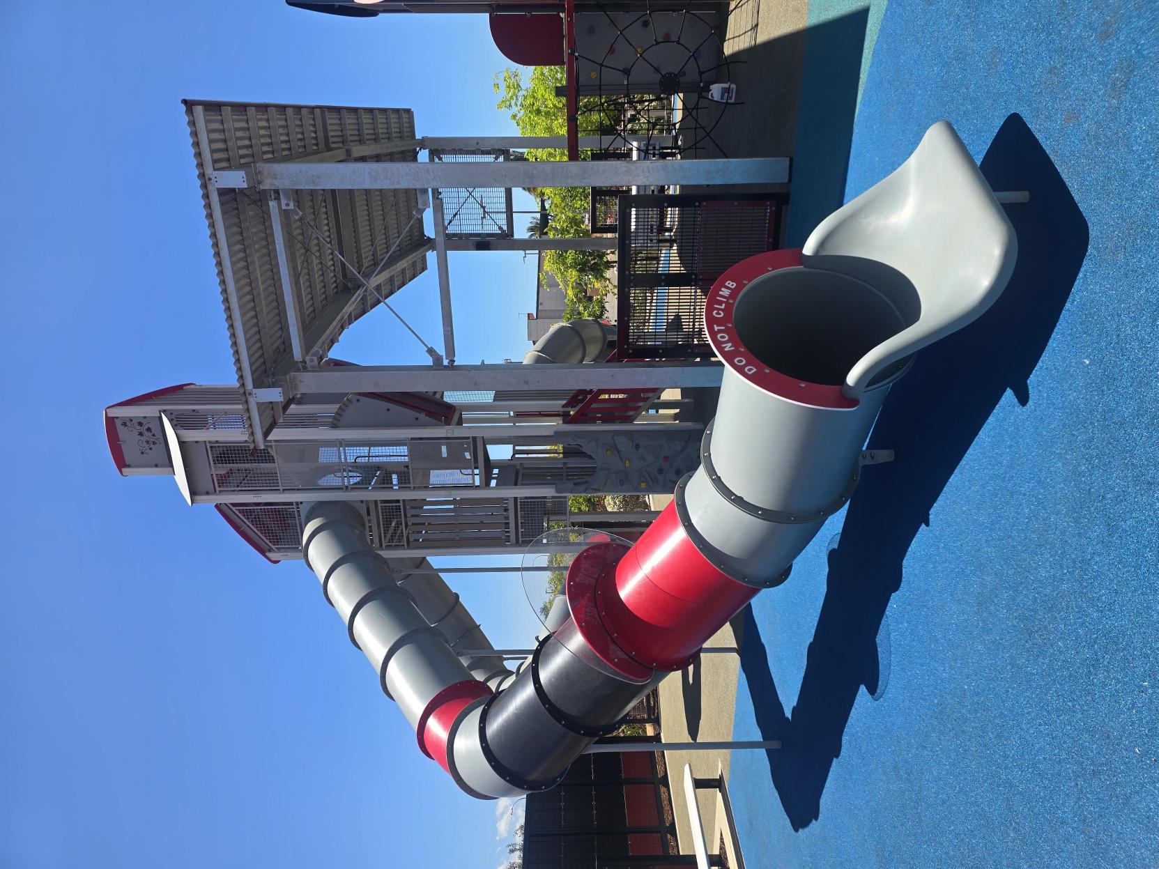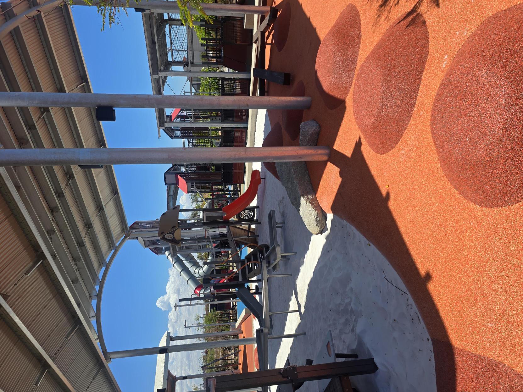The playground includes five large shade structures as well as native trees and shrubs and wetpour rubber softfall surfaces in play areas.